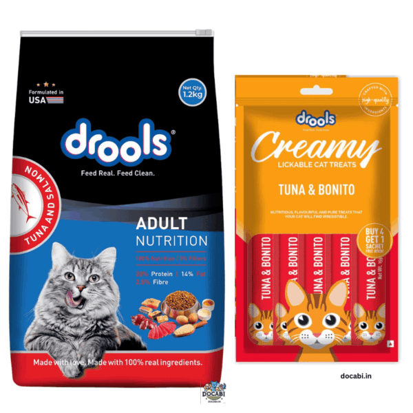 (1Pc)1.2Kg Drools Adult Dry Cat Food, Tuna Salmon +(1pc Drools Creamy treat)