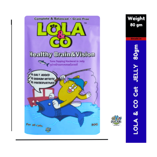 Lola & Co Healthy Brain & Vision is a complete & balanced jelly cat food made with real tuna topped with nutritious mackerel. Its soft jelly texture makes it easy to eat, while the DHA-rich fish supports sharp eyesight and healthy brain development.